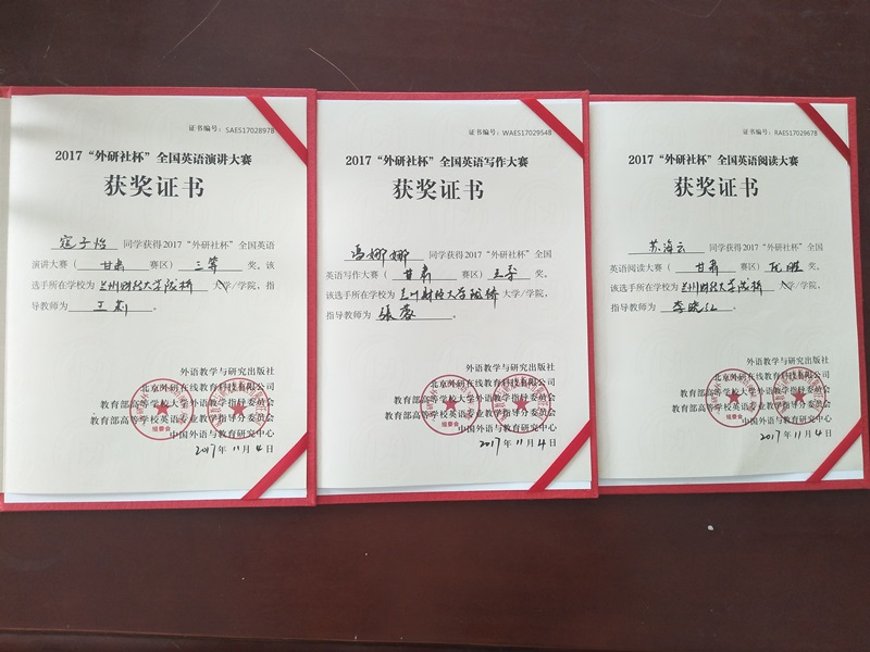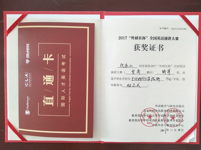 11月4日,2017“外研社杯”全国英语演讲、写作、阅读比赛(甘肃赛区复赛)在兰州文理学院落下帷幕。来自全省21所高校的119名选手参加了比赛,学院4名学生分别参加了三项赛事并获得优异成绩。2014级学生张岳山以甘肃赛区第三名的成绩荣获演讲大赛特等奖;2015级学生寇子怡获得演讲大赛三等奖;2014级学生冯娜娜获得写作大赛三等奖;2016级学生苏海云获得阅读大赛优胜奖。张岳山同学获赠北京外国语大学中国外语测评中心颁发的国际人才英语考试直通卡,可免费参加“国际人才英语考试”考试一次。12月初,张岳山同学将代表甘肃赛区参加在北京举办的“外研社杯”全国英语演讲大赛总决赛。