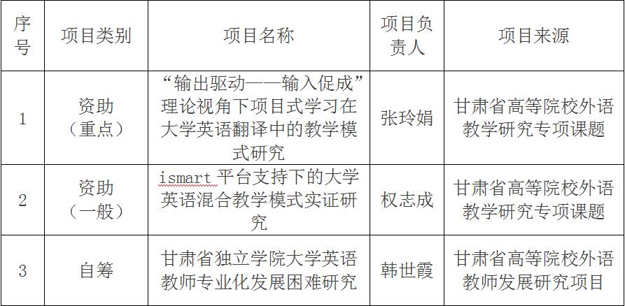 近日,甘肃省社科联分别对2017-2018年度甘肃省高等院校外语教学研究专项课题和甘肃省高等院校外语教师发展研究项目立项评审结果予以了公布。根据评审结果,我院教师申报的3项课题被批准立项,其中2项资助项目,1项自筹项目。