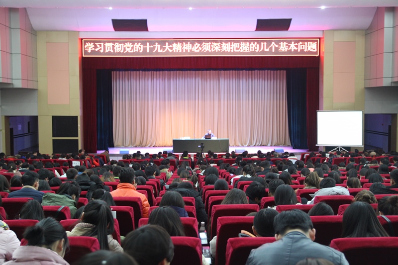 王宗礼教授从“深刻领会党的十九大的主题,深刻理解中国特色社会主义进入新时代这一重大判断,深刻认识和把握我国社会主要矛盾的转化及其重大意义,深刻认识和理解新时代中国共产党的历史使命,深刻认识和理解习近平新时代中国特色社会主义思想的核心要义、主要内涵、基本方略和基本定位,深刻认识和理解我国社会主义现代化建设新的战略安排”六个方面对党的十九大精神作了系统深入的解读阐释。辅导报告深入浅出、主题鲜明、内容丰富、重点突出,既有政治高度、理论深度,又有历史厚度、情感温度,对全校师生深刻理解和准确把握党的十九大精神的思想精髓、丰富内涵、精神实质、核心要义,深刻理解和准确把握党的十九大提出的重大理论观点、重大方针政策、重大工作部署,深入学习领会习近平新时代中国特色社会主义思想,具有重要的指导意义。