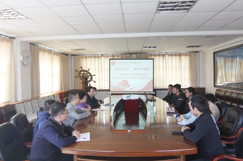 2018年3月29日下午,学院在行政楼二楼会议室举行了爱心善款的交接仪式,学院党委书记王新兰,党委副书记郇东,董事会办公室副主任付乐宁,财政金融系领导班子、全体辅导员,孙国荣同学的父母亲参加了善款交接仪式。交接仪式由党委副书记郇东主持。学院党委书记王新兰代表全体师生将捐助善款交到了孙国荣的父母亲手中。学院领导一再鼓励孙国荣的父母亲要坚强,要有战胜疾病的信心和力量,安心给孩子治病,争取让孩子早日康复。孙国荣的父亲非常激动,他说到:孩子己经毕业快两年了,真的没有想到,学校领导、老师还对他如此关心,非常感激,并对所有关心和捐助的师生表示衷心的感谢。