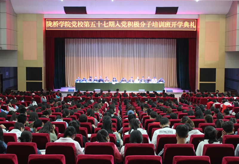 4月18日下午,陇桥学院党委党校第57期入党积极分子培训班开学典礼在学术报告厅举行。学院党委书记王新兰教授,党委副书记、副院长马义哈,党委委员、副院长杨培权,党委委员梁磊,党委委员刘伟,各党总支书记出席典礼,各系党务秘书、党委工作部老师及全体培训学员共700余人参加了典礼。典礼由党委副书记、副院长马义哈主持。