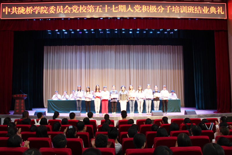 6月1日下午,陇桥学院党委党校在学术报告厅举行了第五十七期入党积极分子培训班结业典礼。学院党委书记王新兰,党委副书记、副院长马义哈,党委副书记、党校校长郇东,党委委员胡国霞、刘伟及各党总支书记出席典礼,各系党务秘书、党委工作部老师及全体培训学员共700余人参加了典礼。典礼由党委副书记、副院长马义哈主持。