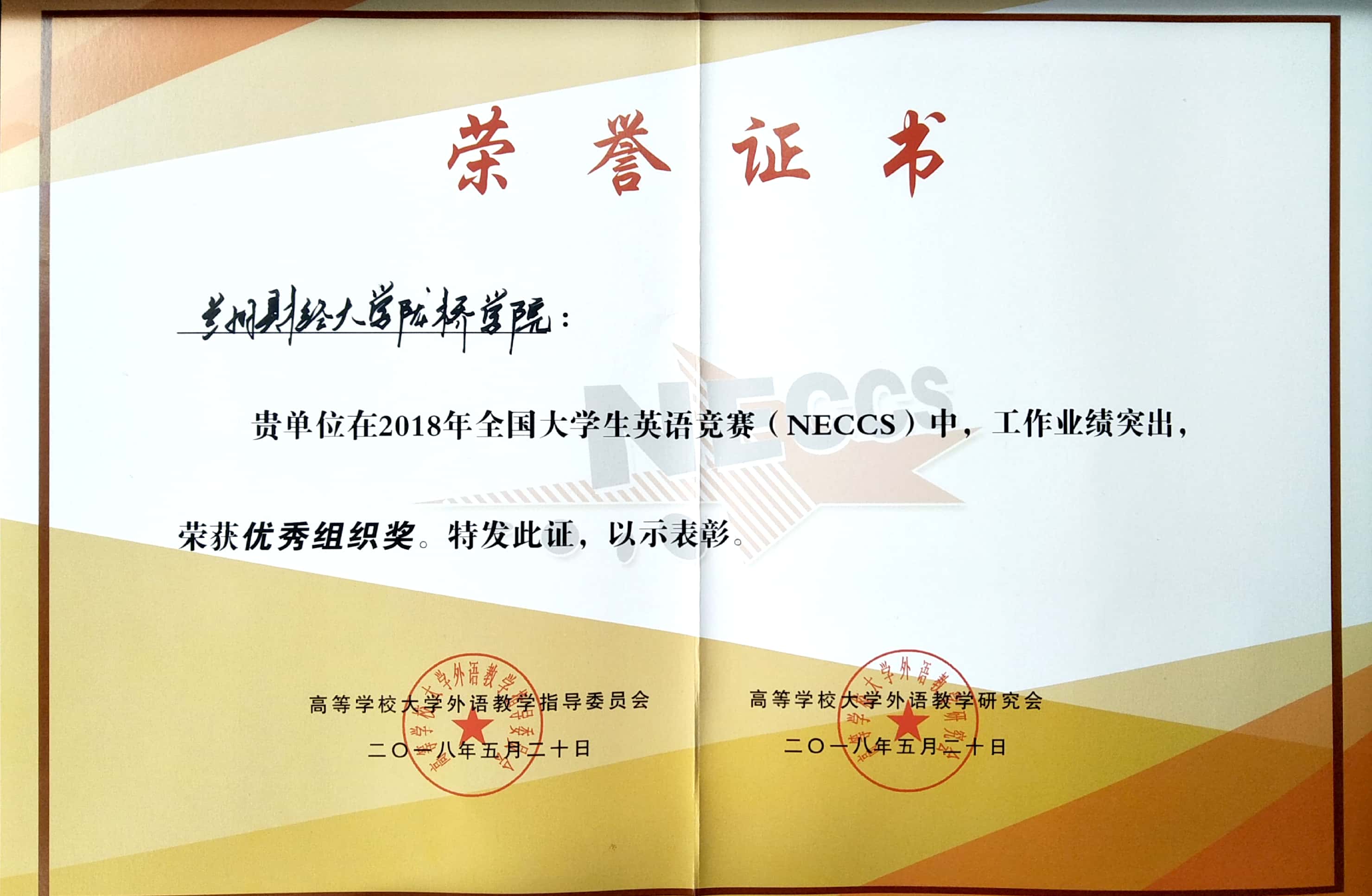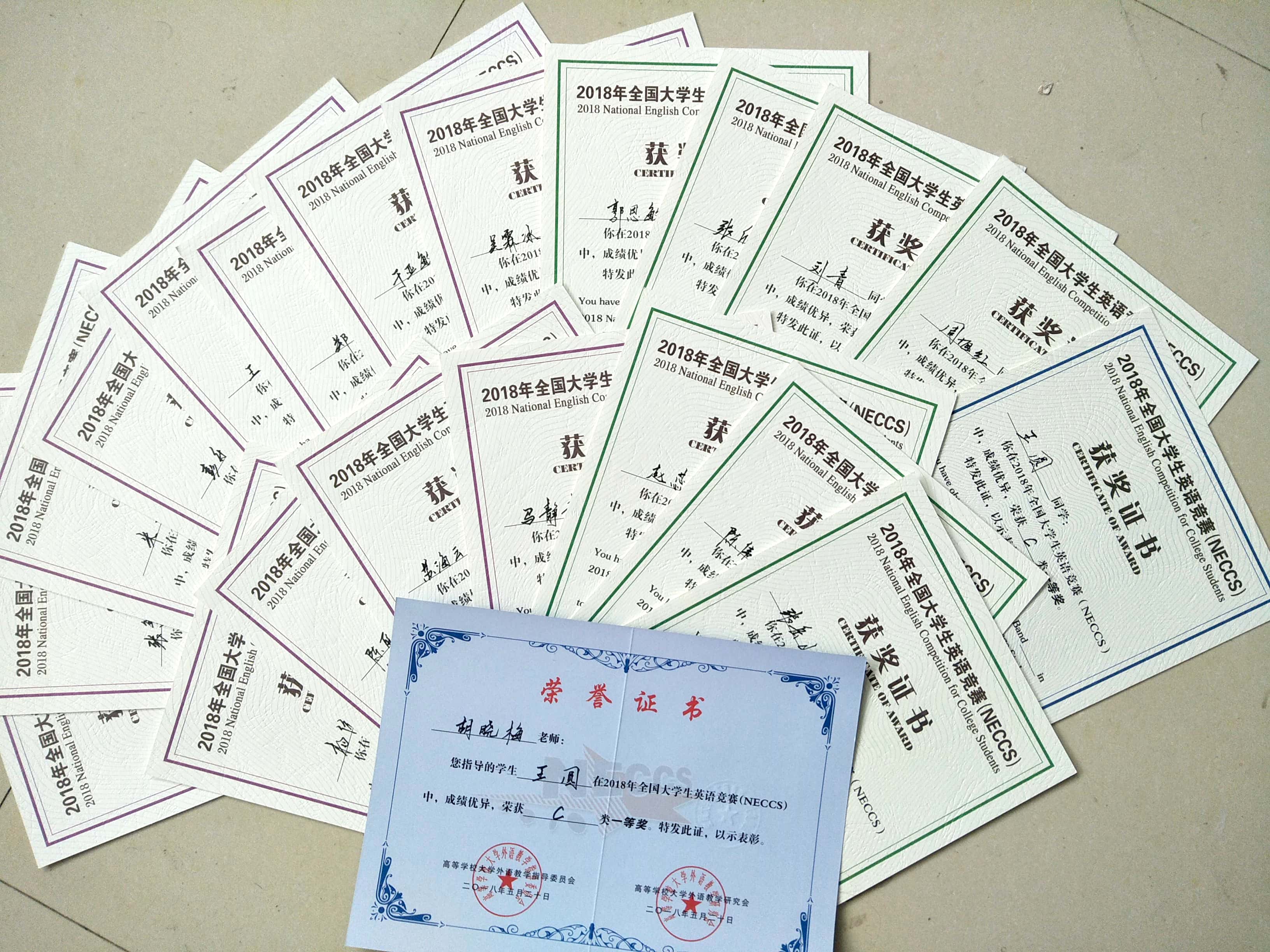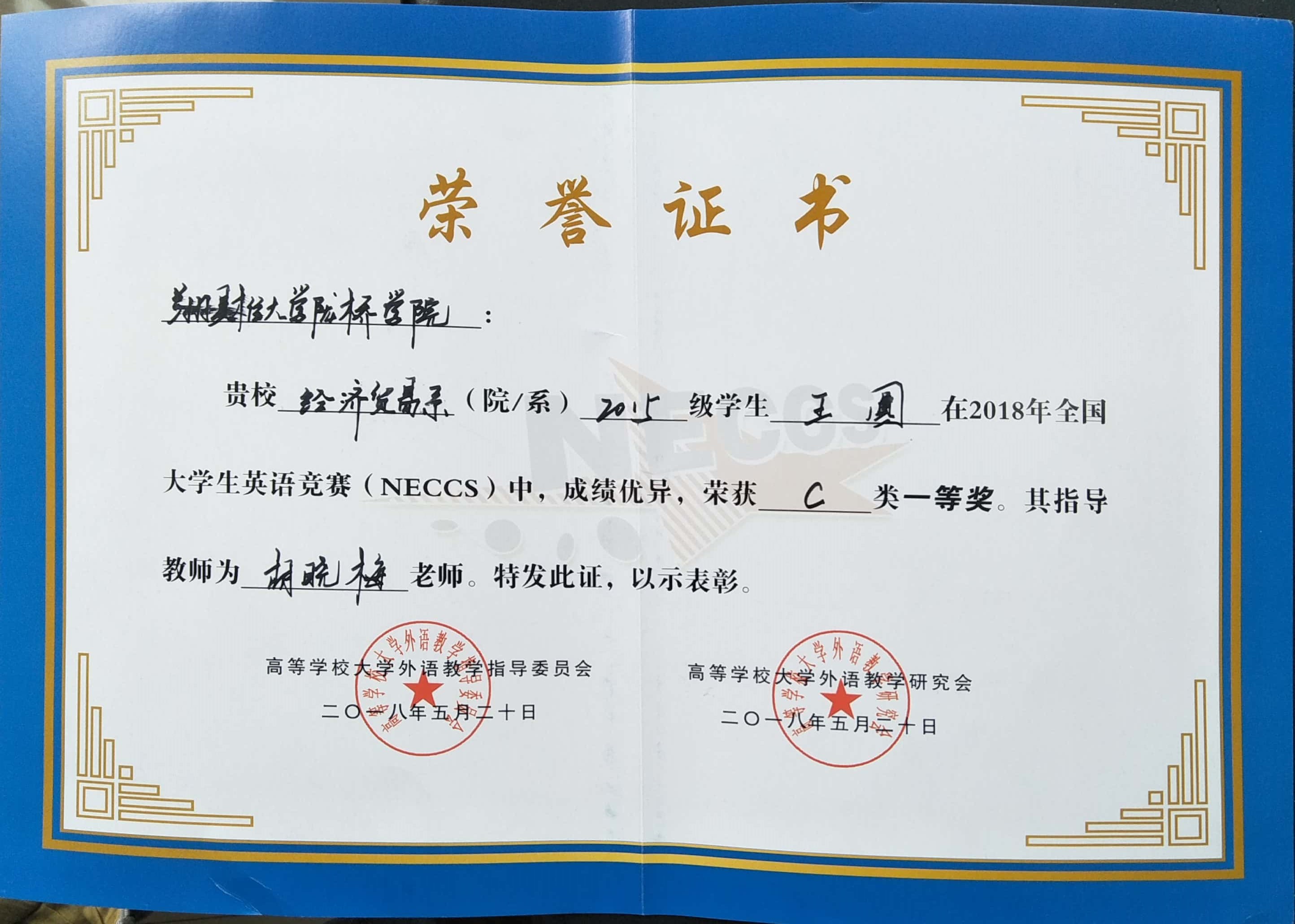 在2018年全国大学生英语竞赛(NECCS)中我院学生获多个奖项,其中王圆同学获非专业组省级一等奖,其他获非专业组二等奖4项,三等奖8项;专业组二等奖3项,三等奖4项;胡晓梅老师获得优秀指导教师奖,学院获优秀组织奖。