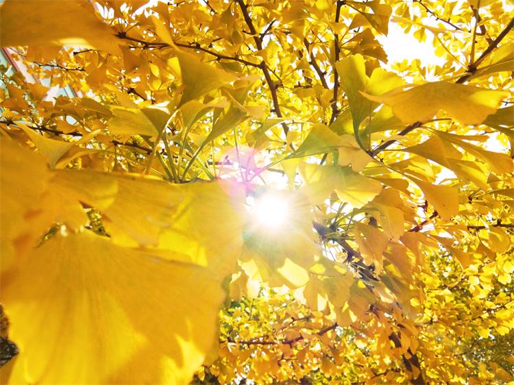 林间,黄叶纷扬的飘散在充满阳光的小路上