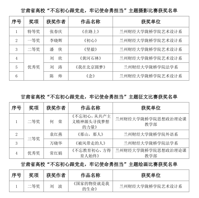 为深入学习贯彻习近平新时代中国特色社会主义思想和党的十九大精神,贯彻落实全国、全省教育大会精神,庆祝改革开放40周年,继续推进“两学一做”学习教育常态化制度化,营造“不忘初心,牢记使命”主题教育氛围,写好新时代甘肃高等教育改革发展“奋进之笔”,由省委教育工委主办、兰州财经大学承办,在全省高校开展“不忘初心跟党走,牢记使命勇担当”主题征文、书画摄影、微党课视频创作大赛。本次大赛我院师生踊跃参加,获得了良好成绩,其中,我院艺术设计系主任张春庆的摄影作品《在路上》获得特等奖。
