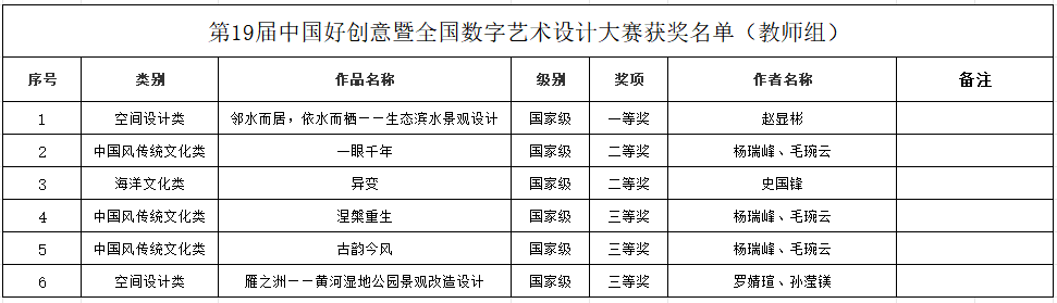 在本次大赛教师组比赛中,我校教师凭借扎实的专业功底和前瞻的创新思维,在多个赛道中脱颖而出。中国风传统文化类作品《一眼千年》荣获国家级二等奖;《涅槃重生》和《古韵今风》分别获国家级三等奖,展现出传统文化在当代的创新活力。空间设计类作品《邻水而居,依水而栖——生态滨水景观设计》获国家级一等奖;《雁之洲——黄河湿地公园景观改造设计》获国家级三等奖。海洋文化类作品《异变》获国家级二等奖。