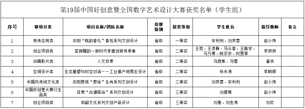 在学生组比赛中,我校学子同样表现抢眼,共获得省级一等奖1项、二等奖3项、三等奖3项。视传应用类作品《庆阳“陇韵香礼”香包系列文创设计》获省级一等奖;空间设计类作品《生态重塑与时空对话——工业遗产地再生设计》获省级二等奖;创业项目类作品《窑狮醒韵——新时代非遗创新传承者》和《仰韶文化系列文创产品设计》分获省级二、三等奖;动画影片类作品《人文甘肃》荣获省级二等奖,展现出学生扎实的专业基础和创新能力。中国风传统文化类和赛事衍生品类作品《庆阳剪纸“剪给”生肖系列文创设计》和《甘肃“古道驿站”系列文创设计》均获省级三等奖,体现出学生对本土文化的深入理解和创新表达能力。