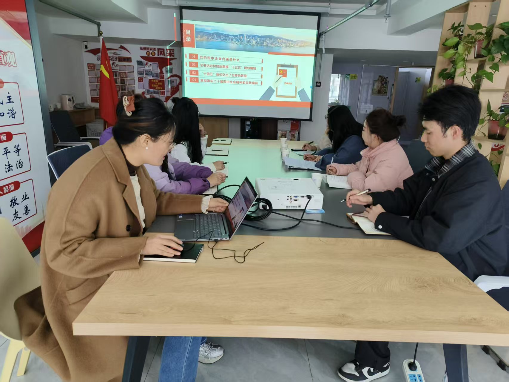 活动以集体观看党的二十届四中全会视频开场,与会人员深入领会全会关于国家治理体系和治理能力现代化的重要部署。随后,马克思主义学院党支部副书记赵胐领学《习近平谈治国理政》第五卷相关内容,结合高校思政教育实践经验,对“以人民为中心”“全过程人民民主”等核心内容进行详细解读,引导党员群众从原文中汲取智慧。