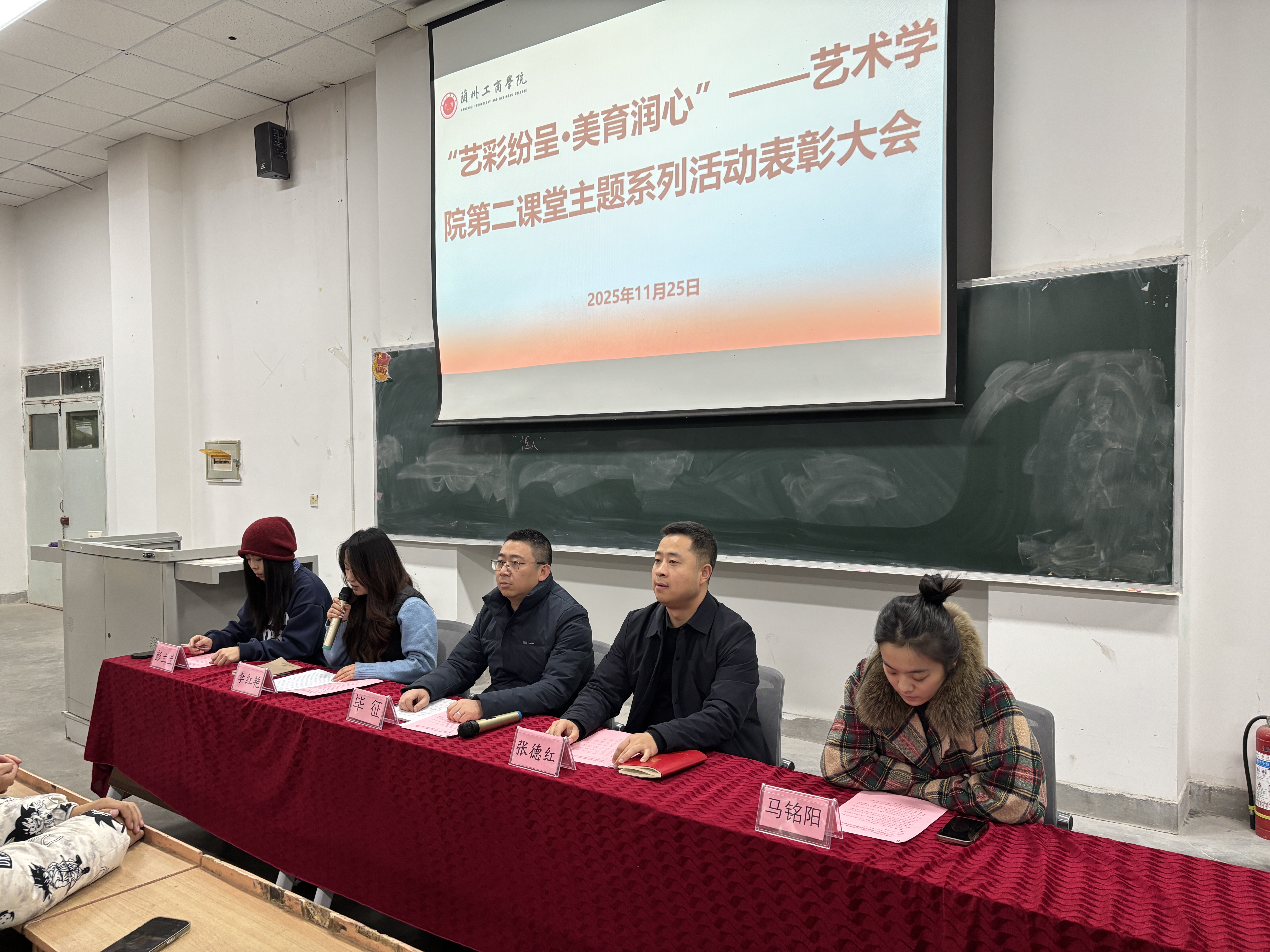 为表彰先进典型、总结工作经验,进一步深耕美育教育沃土,激发学生全面发展活力。11月25日,艺术学院对“艺彩纷呈·美育润心”第二课堂主题系列活动、“擘画蓝图,艺路启航”学业规划书设计大赛及“书香兰工商”2025年暑期阅读活动中荣获书香班级、书香宿舍的获奖学生进行了集中表彰。学院党委书记毕征、行政院长张德红、辅导员彭兰兰、马铭阳及全体获奖学生及团学干部参加了大会,大会由学院办公室主任李红艳主持。