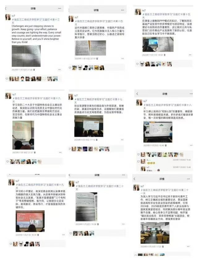 活动期间,各年级学子积极响应,热情参与其中。他们借助小红书、微信朋友圈等平台,发起“我在兰工商经济学院学习”话题,以图文、视频等形式,定格在自习室专注钻研、于图书馆静心阅读的珍贵瞬间。打卡内容丰富鲜活,有自习室里挑灯夜战、攻克难题的坚毅身影,有图书馆中沉浸书海、勤做笔记的专注模样,尽显积极进取、昂扬向上的精神风采。