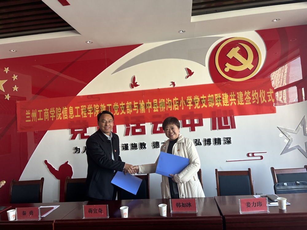 仪式中,信息工程学院教工党支部书记韩如冰对《兰州工商学院信息工程学院教工党支部与榆中县柳沟店小学党支部联建方案》进行详细解读,从“合作方向、具体举措、预期成果”三个维度清晰勾勒联建蓝图。在全体参会人员的热烈掌声中,信息工程学院教工党支部书记韩如冰与榆中县党支部书记蒋宜奇共同签署联建协议。