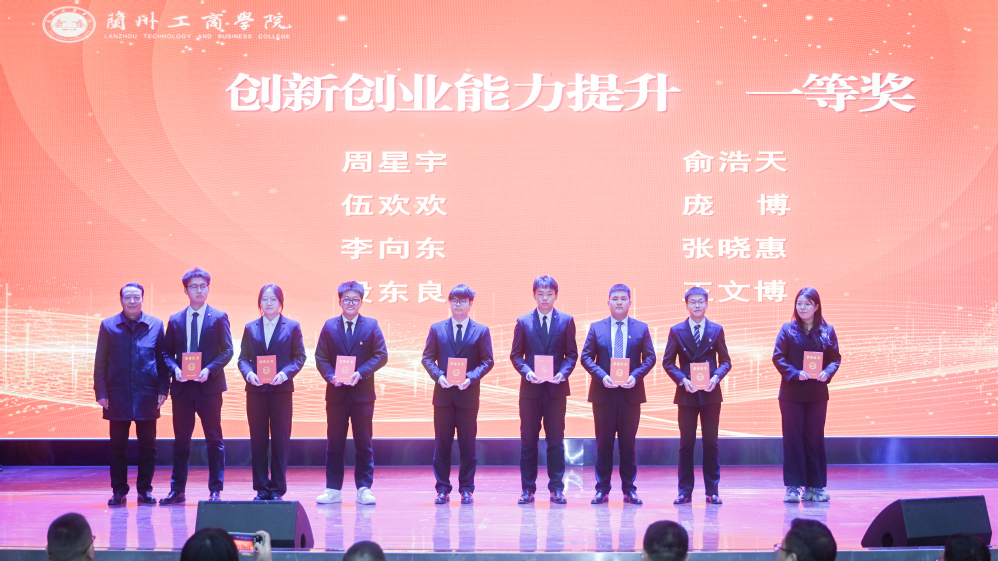 在热烈的氛围中,大会先后进行了多项表彰。张浩院长宣读了《兰州工商学院2024-2025学年学生创新创业能力提升奖表彰决定》,王华栋、张春庆分别为荣获创新创业能力提升一、二等奖的学生代表颁奖。