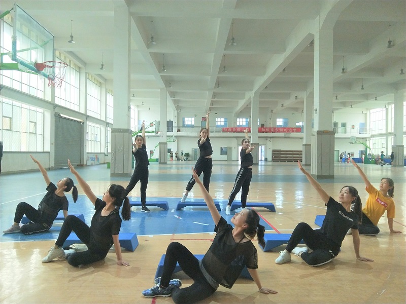 健美操训练也在热火朝天地进行。训练过程中,教练员对每个动作进行标准规范化的指导,队员们态度诚恳认真,积极训练,运动员们跟着音乐进行艰苦的训练。经过训练,队员们现已熟练掌握动作要领。