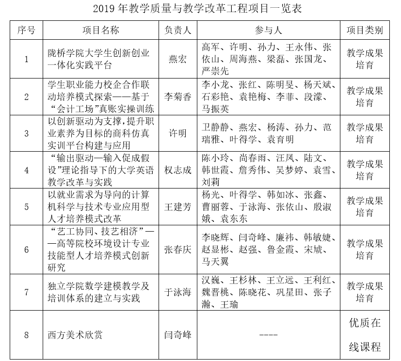 近日,省教育厅下发了《甘肃省教育厅关于公布 2019 年高等学校教学质量与教学改革工程和创新创业教育改革项目的通知》(甘教高〔2019〕7 号),学院共8项教学质量与教学改革工程项目获立项,其中教学成果培育项目7项,优质在线课程1门。