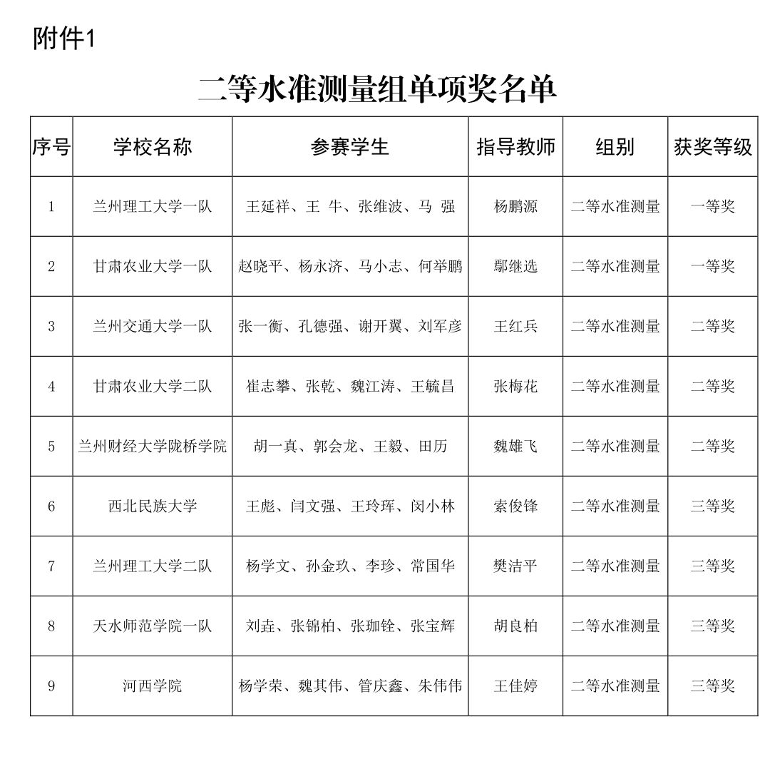 由甘肃省教育厅主办、兰州理工大学承办的“第二届甘肃省大学生测绘技能大赛暨第六届全国大学生测绘技能大赛选拔赛”已于2019年11月2日—3日顺利举办。近日从省教育厅公布的获奖名单获悉,我院由土木工程系魏雄飞老师指导,2017级土木工程专业的胡一真、郭会龙、王毅、田历四名同学组成的代表队荣获本届大赛“二等水准测量单项二等奖”。