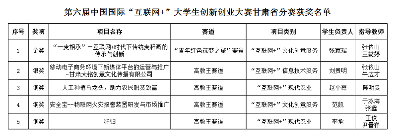 在第六届中国国际“互联网+” 大学生创新创业大赛甘肃省分赛决赛中,我院遴选出的8个优秀项目参加了甘肃省分赛高教主赛道、“青年红色筑梦之旅”两个赛道的比赛。经最终路演答辩,我院共斩获金奖1项,银奖1项,铜奖3项,获奖数量及获奖等级均取得了历史性突破。