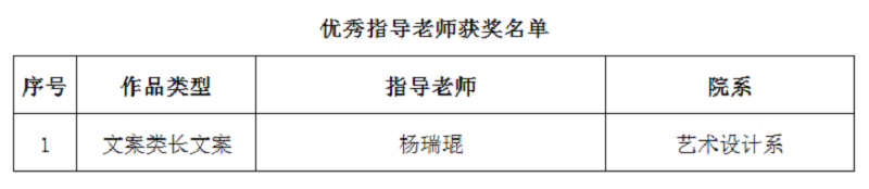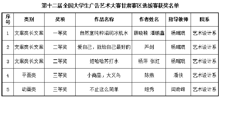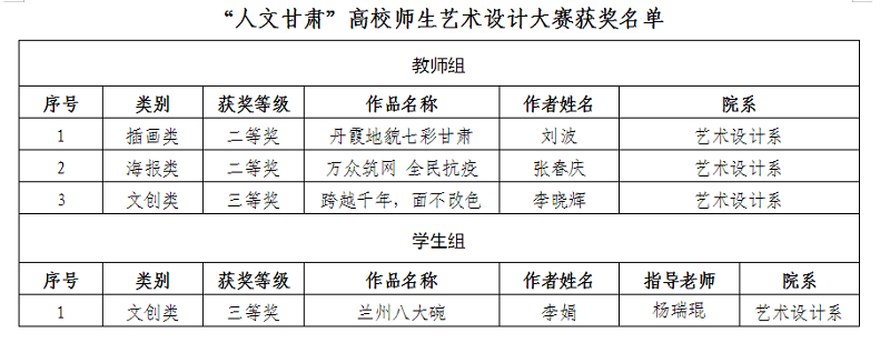 在由甘肃省教育厅主办的第十二届全国大学生广告艺术大赛甘肃赛区选拔赛暨“人文甘肃”高校师生艺术设计大赛中,我院收获一等奖1项、二等奖4项、三等奖4项,艺术设计系杨瑞琨老师获优秀指导老师。