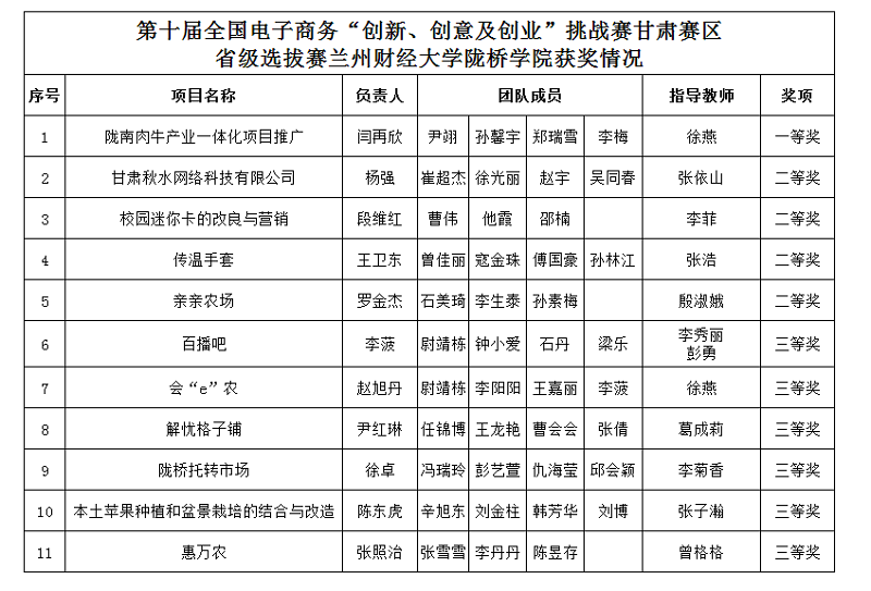 在第十届全国大学生电子商务“创新、创意及创业”挑战赛甘肃赛区省级选拔赛决赛在中,我院遴选出37个项目参加全省决赛,最终获得一等奖1项、二等奖4项、三等奖6项。
