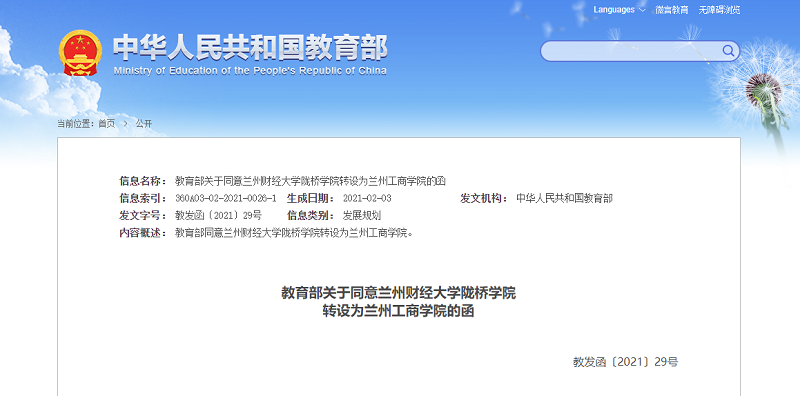 近日,教育部印发《关于同意兰州财经大学陇桥学院转设为兰州工商学院的函》(教发函〔2021〕29号)。