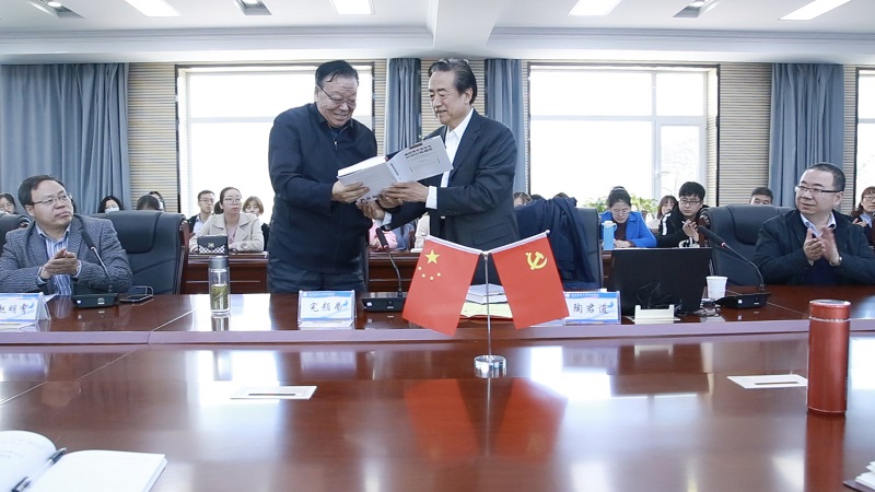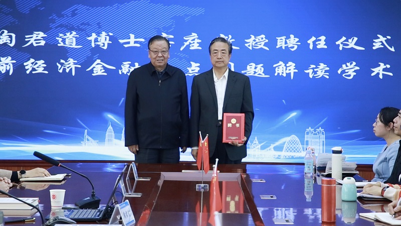 活动中,完颜弟校长为陶君道博士颁发客座教授聘书,陶君道博士为学校领导及与会师生赠送著作,并做了题为《当前经济金融热点问题解读》的报告。