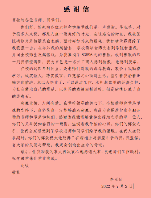 本次爱心募捐活动,充分彰显了兰州工商学院的社会责任和担当,也展现了我校师生的互爱互助精神,每一位兰工商人都在用真情为李亚仙同学加油打气。涓涓细流、汇成大爱,兰工商全体师生祝愿李亚仙同学战胜病魔,早日康复,开启人生新的旅程。