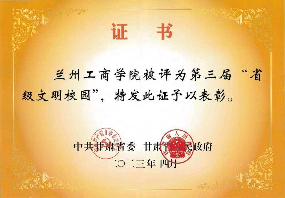 根据中共甘肃省委、甘肃省人民政府下发《关于命名表彰第十六批省级文明建设先进集体、先进工作者和第四届甘肃省文明家庭、第三届省级文明校园的决定》(甘委〔2023〕33号)文件,兰州工商学院获评第三届省级文明校园。