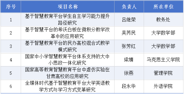 近日,甘肃省教育厅公布了《关于公布2024年全域全员全过程使用智慧教育平台专项研究课题立项结果的通知》(甘教技函〔2024〕27号),我校共6个项目获批立项。
