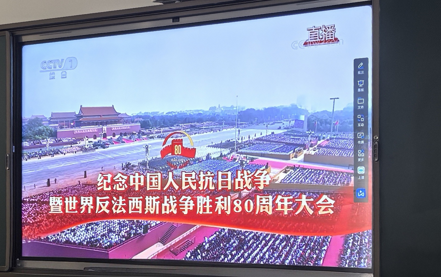 9月3日上午,马克思主义学院组织全体思政课教师集中观看“中国人民抗日战争暨世界反法西斯战争胜利80周年纪念大会及阅兵仪式”实况直播,共同见证这场展现国家强大、民族复兴的盛大仪式。
