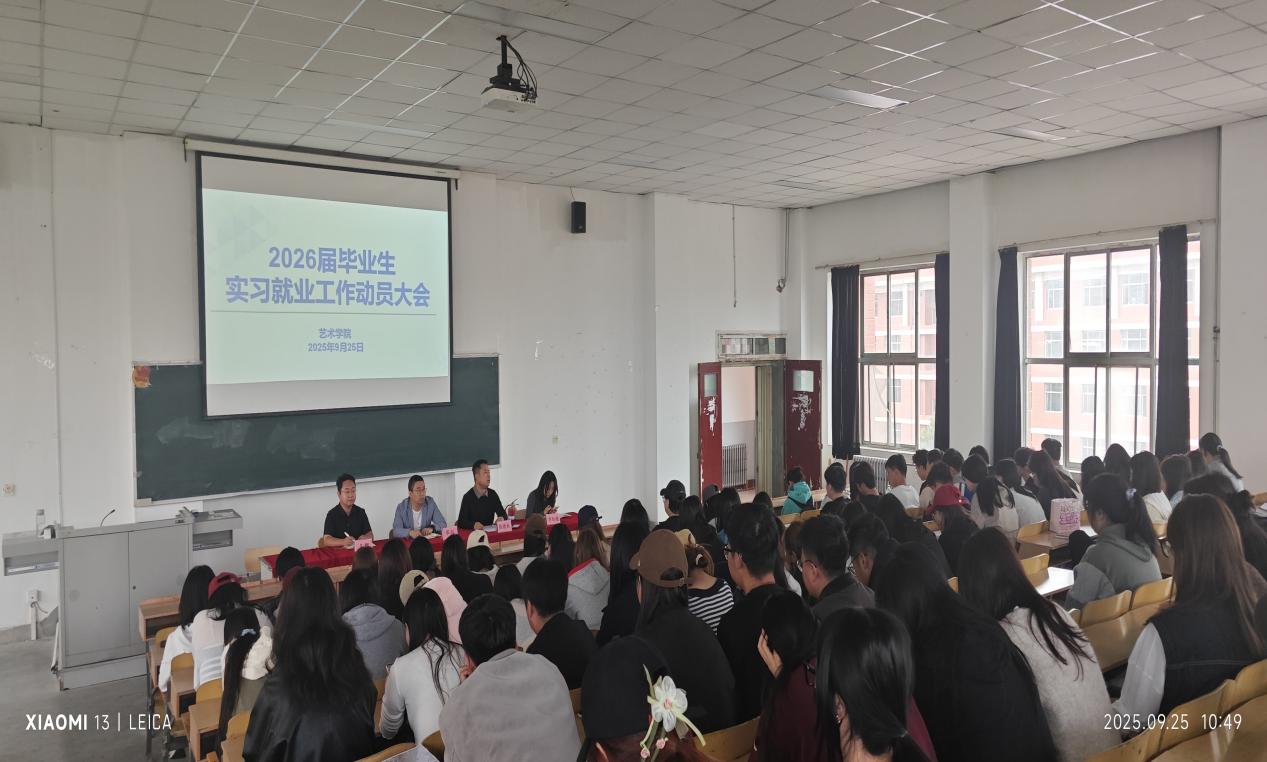 为全面部署与推进2026届毕业生实习与就业工作,引导学生准确把握就业形势,实现高质量就业。9月25日,艺术学院在善问楼415阶梯教室召开了2026届毕业生实习就业工作动员大会。学院党委书记毕征、行政院长张德红、毕业班辅导员王朝及2026届全体毕业生参加了此次会议。会议由学院办公室主任李红艳主持。