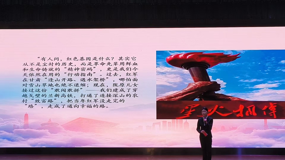 演出在主题演讲《红墙铸理想,潮头显担当——在新时代赓续“八办”精神》中拉开帷幕,节目深刻阐释了“八办”精神在新时代的内涵与价值。随后,红色情景剧《沙沙绿洲》通过生动演绎再现了陇原儿女与风沙抗争的感人故事,展现了八步沙林场“六老汉”困难面前不低头、敢把沙漠变绿洲的奋斗精神。穿越时空的对话《火热的青春》以创新形式展开新时代青年与革命先辈的心灵对话,激荡理想信念,彰显时代担当。主题演讲《传承陇原红色基因,走好新时代长征路》以图文并茂的方式,引导学员们思考如何在新时代践行长征精神。红色情景剧《永恒的星光》通过细腻的情感表达,传递了初心如磐、使命如炬的精神力量。最后,集体朗诵《铭记烽火征程,续写陇原华章》将活动推向高潮,铿锵有力的诵读声回荡全场,唤起深沉的家国情怀与奋进意志。