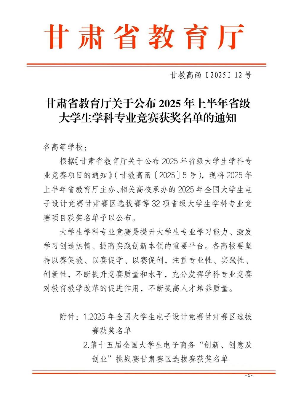 根据《甘肃省教育厅关于公布 2025 年省级大学生学科专业竞赛项目的通知》(甘教高函〔2025〕5 号)文件,在2025 年上半年由甘肃省教育厅主办、相关高校承办的 2025 年全国大学生电子设计竞赛甘肃赛区选拔赛等 32 项省级大学生学科专业竞赛项目获奖名单,我校师生共获奖92项,其中特等奖2项,一等奖9项,二等奖29项,三等奖51项,最佳创业奖1项;彭勇、魏婕、葛欣、梁磊、张浩、马进宝、李互武、曾格格、李晓辉、潘瑶、史国锋、杨瑞峰、赵小伟等13名教师获“优秀指导教师”,学校获“优秀组织奖”3项。
