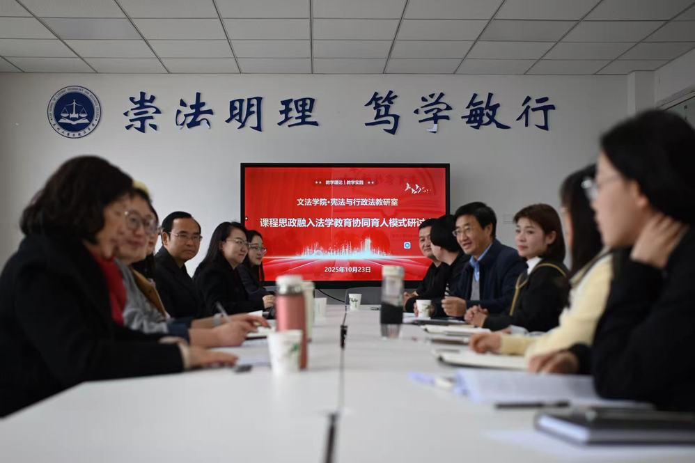 2025 年 10 月 23 日下午在慎思楼4楼会议室,宪法与行政法教研室召开“课程思政融入法学教育协同育人模式”研讨会,会议聚焦法学课程思政融入路径,赋能学院教学质量提升与人才培养。研讨会由宪法与行政法教研室主任孔佰洪主持,李玉璧院长、教学院长葛欣出席,特邀吴丹博士、田庆锋副教授与教研室全体成员研讨交流。