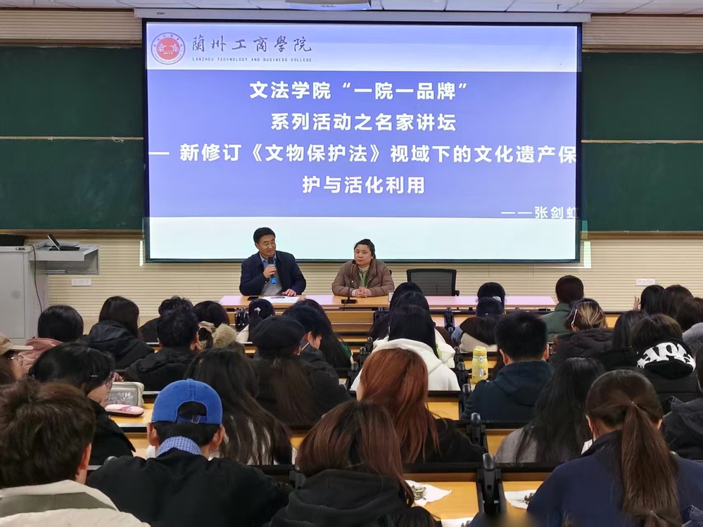 为深入学习贯彻习近平法治思想和习近平总书记关于文化遗产保护的重要指示精神,扎实推进学生思想政治教育和专业素养提升,营造浓厚的校园学术氛围,2025年11月7日,兰州工商学院文法学院在综合教学楼C504教室举办“一院一品牌”系列活动之名家讲坛。本次讲座特邀北京大学法学博士、故宫博物院研究馆员、国家社科基金重大项目首席专家张剑虹教授,作题为《新修订〈文物保护法〉视域下的文化遗产保护与活化利用》的专题报告。文法学院师生代表共计200余人参加活动。