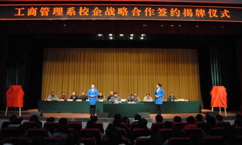 仪式上,兰州毅德商贸城有限公司巨丁经理和工商管理系李金峰主任分别发表了热情洋溢的致辞,对双方举行校企战略合作,今后实现资源共享和合作共赢寄予美好希望。燕宏助理代表学院发表讲话,希望工商管理系和兰州毅德商贸城有限公司这样实力雄厚、影响较大的一流企业积极探索校企战略合作模式新道路,不断充实双方在商贸物流开发和运营事业中理论和实践相结合的内涵,带动双方的各项事业实现新的突破,并在以后的战略合作中,真正实现双方资源共享、互惠双赢,培养出大量基础厚、素质高、能力强的应用型专门人才。随后,举行了战略合作签约仪式,兰州毅德商贸城有限公司副总经理张建辉和学院党委副书记、副院长李玉仓分别为双方建立的学生实训基地和人才培养基地揭牌。