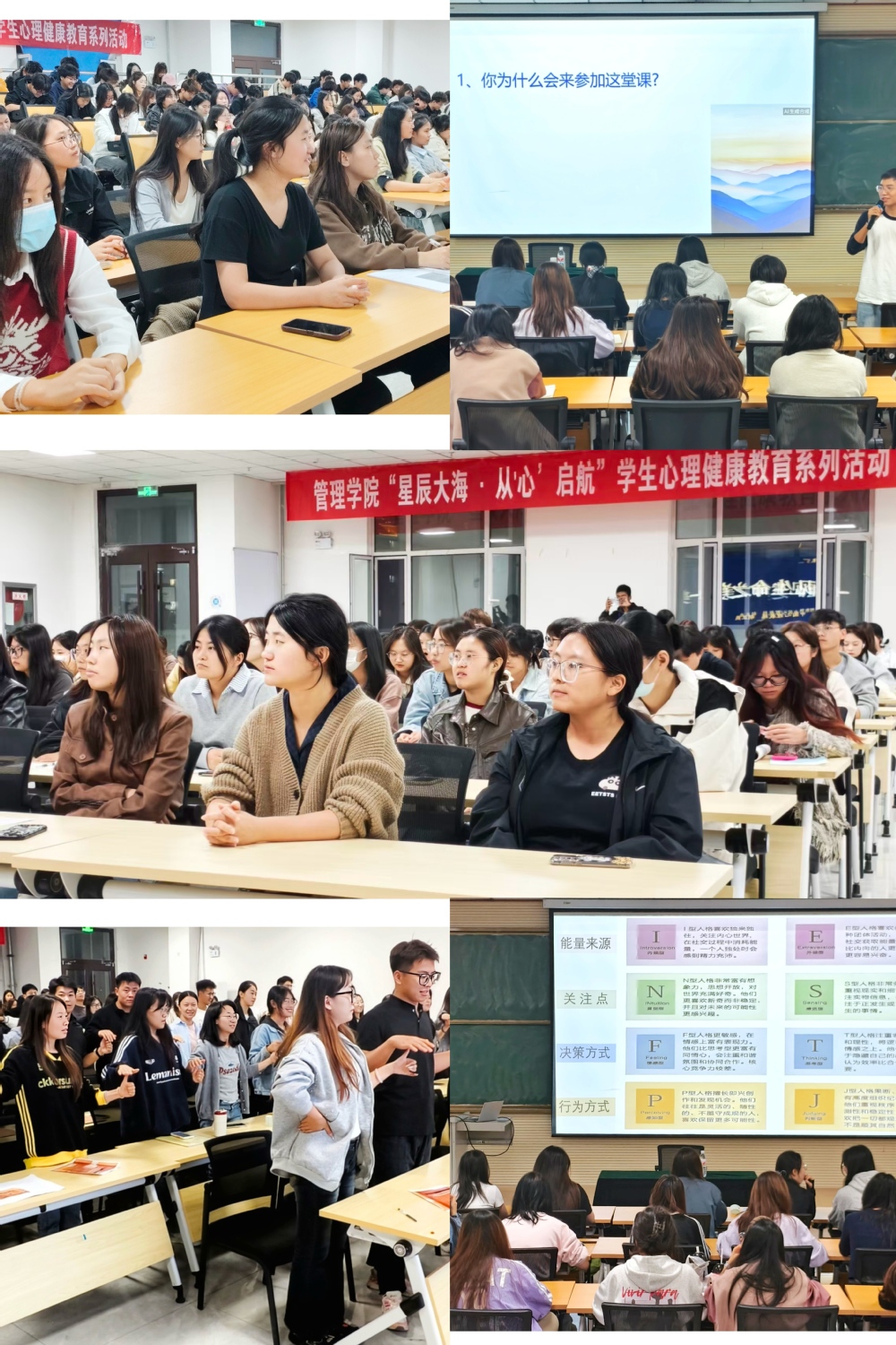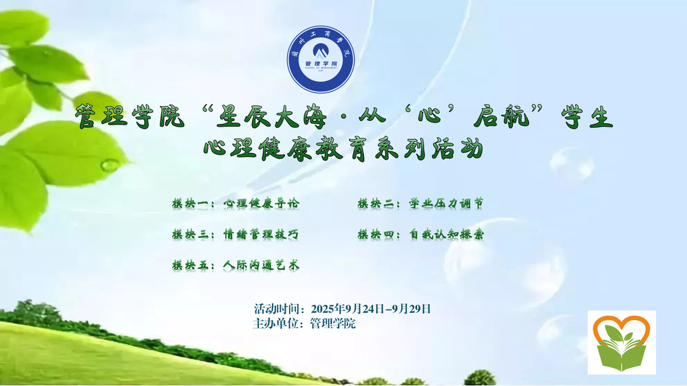 为进一步加强学生心理健康教育工作,提升学生心理素质,助力学生全面发展。根据《管理学院“星辰大海·从心启航”学生心理健康教育系列活动实施方案》,学院于9月24日-9月29日组织开展了2025年“星辰大海・从‘心’启航” 学生心理健康教育系列活动,活动围绕适应性教育、心理调适、恋爱教育三大核心模块,为全院学生搭建起心理健康成长的 “暖心平台”。 本次系列活动以 “关爱学生心理健康,助力学生成长成才” 为核心目标,通过 “理论 + 实践”“团体 + 个体”“普及 + 精准” 的多元形式,让心理健康教育更具针对性与实效性。