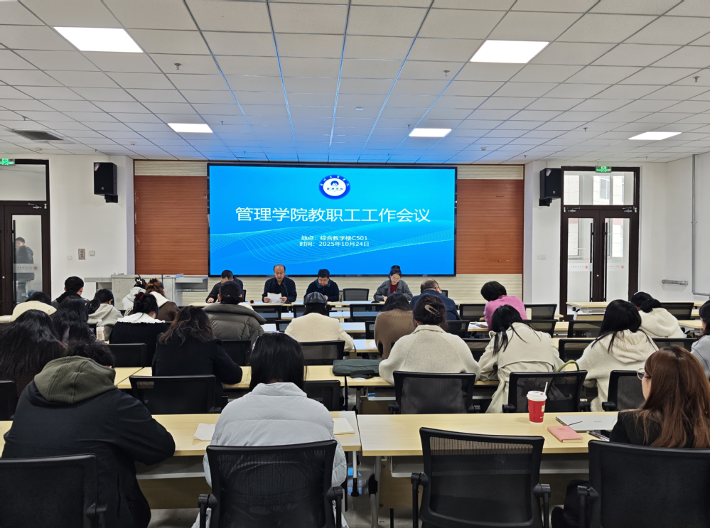 为统筹推进各项教学重点工作,夯实教学质量根基,赋能学院内涵式发展,2025年10月24日,管理学院在综合教学楼C501召开全院教职工工作会议。学院党委书记马进宝主持会议,全体教职工参会。