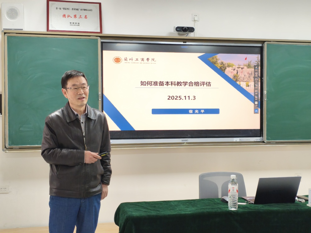为深入理解和有效落实本科教学工作合格评估的各项要求,全面提升学院迎评工作质量,2025113日,管理学院邀请学校教学常务副校长宿光平教授,在综合教学楼A304教室为全院教师作了一场全面、深入的合格评估专题辅导讲座。讲座由管理学院教学院长徐燕主持,学院全体教师参加。