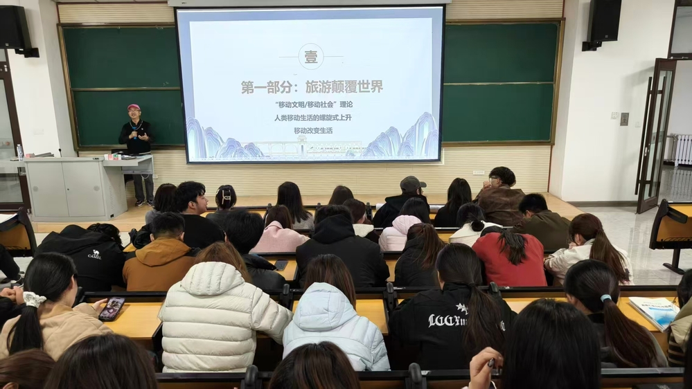 讲座中,刘思敏教授分享了其原创理论体系,以全新视角解读旅游本质与发展路径,以“世界那么大,我想去看看”的经典辞职信为例,引发师生对人生价值与移动生活的共鸣。他强调,旅游不仅是经济产业,更是“文明与文明的对话”,能促进人与自然、历史及自我的深度联结。在问答环节,师生就移动社会与可持续发展、技术对旅游的影响等问题展开热烈讨论。