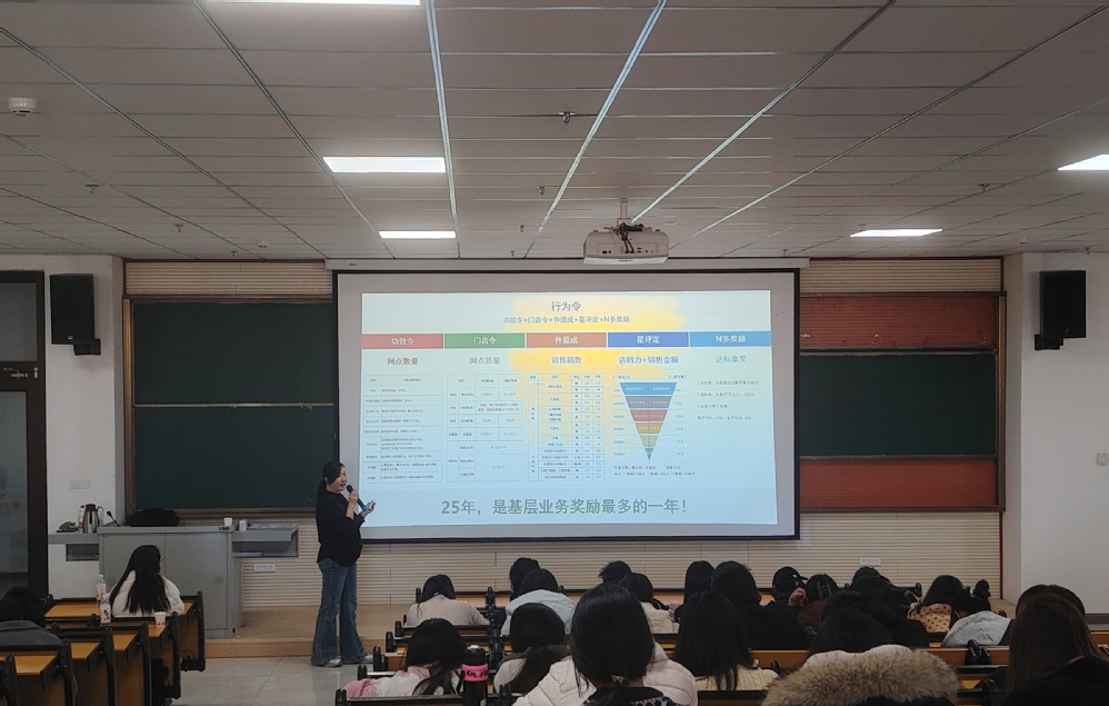讲座伊始,陈龙吟女士结合自身在人力资源业务伙伴(HRBP)领域长达十七年的丰富经验,阐述了快消行业人力资源工作的特点与挑战。随后,陈龙吟女士系统介绍了其主导推动的“靶心战略”在西北区域组织能力建设中的应用实践。她通过详实的案例、具体的数据和生动的案例,分享了如何识别业务痛点、定位组织能力短板、设计并落地人力资源解决方案,最终实现区域业绩持续增长和组织韧性的全面提升。在互动环节,同学们踊跃提问,围绕“HRBP如何快速理解业务逻辑”“数字化对人力资源工作的影响”“如何平衡短期业务压力与长期组织建设”等问题与陈女士进行了深入交流。陈女士耐心解答,并鼓励同学们在校期间注重培养综合素养,既要扎实掌握专业知识,也要主动拓展行业视野,提升解决实际问题的能力。