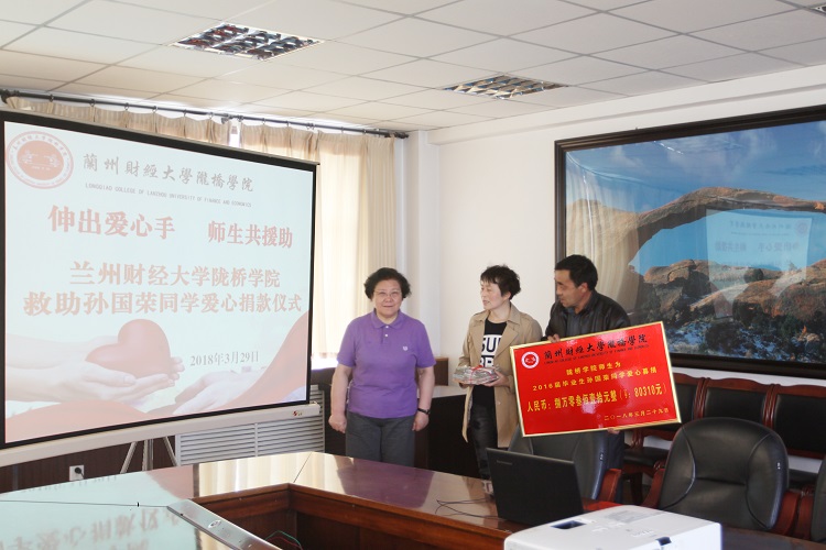 2018年3月29日下午,学院在行政楼二楼会议室举行了爱心善款的交接仪式,学院党委书记王新兰,党委副书记郇东,董事会办公室副主任付乐宁,财政金融系领导班子、全体辅导员,孙国荣同学的父母亲参加了善款交接仪式。交接仪式由党委副书记郇东主持。学院党委书记王新兰代表全体师生将捐助善款交到了孙国荣的父母亲手中。学院领导一再鼓励孙国荣的父母亲要坚强,要有战胜疾病的信心和力量,安心给孩子治病,争取让孩子早日康复。孙国荣的父亲非常激动,他说到:孩子己经毕业快两年了,真的没有想到,学校领导、老师还对他如此关心,非常感激,并对所有关心和捐助的师生表示衷心的感谢。