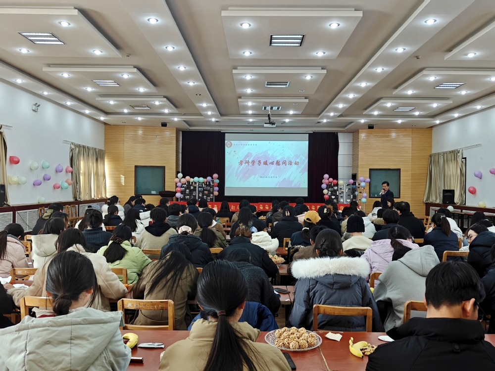 为厚植育人情怀,切实关怀2022级考研学子,缓解其备考压力,坚定冲刺信心,2025年12月17日,经济学院在学术报告厅三楼开展考研学子暖心慰问活动。学院领导班子成员、毕业班辅导员及2022级全体考研学生参会,活动由行政院长周欣主持。