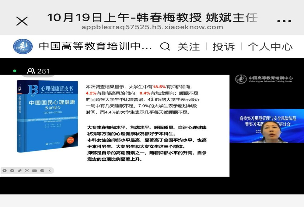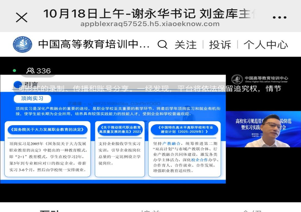 为规范和加强高校实习管理工作,确保学校及学院实习工作平稳有序,有效防范和化解各类安全风险,提高学生实习工作质量和水平,10月18日—19日,会计学院教学院长李菊香教授、教学院长助理武璇老师、教学秘书席尚老师线上参加了由中国高等教育培训中心主办的“高校实习规范管理与安全风险防范暨实习实践教学改革”研讨会,主要围绕高校学生实习实践面临困境与对策、实习舆情风险防范与处置、人工智能赋能大学生实习实践路径等方面展开交流学习。