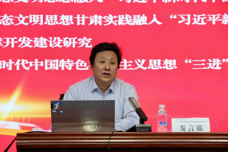 主旨报告环节由我院教学院长张胜闻教授主持。甘肃省“习近平新时代中国特色社会主义思想概论”分教指委主任委员蔡文成教授紧扣党的二十届四中全会精神,系统阐释把握“十五五”时期历史方位的辩证要义。作为中国式现代化关键承启阶段,其辩证思维为统筹生态环境保护与经济社会发展、践行习近平生态文明思想,提供了重要方法论指引。兰州大学习近平生态文明思想理论与实践研究中心主任宫长瑞教授系统阐发习近平生态文明思想的概念谱系与原创性贡献。强调习近平生态文明思想核心概念逻辑严密,明确生态文明建设的价值目标、战略愿景与实践路径,为生态文明教学与实践筑牢学理根基。兰州大学习近平生态文明思想理论与实践研究中心副主任赵序茅教授以“中国式现代化的生态意蕴”为议题,溯源中国传统文化中的生态智慧,梳理党史中绿色发展思想的演进脉络,阐释习近平生态文明思想的理论精髓与实践要求,生动呈现生态文明建设的甘肃样本。