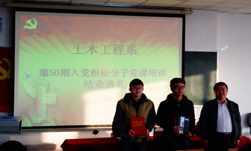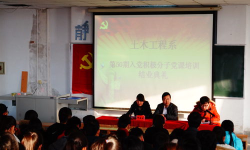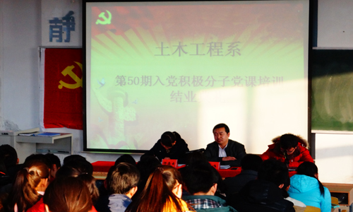 学院党校第五十期入党积极分子培训工作已经结束,经过近一个月的院系两级培训,我系48名学员已圆满完成全部培训任务,顺利结业。根据土木工程系党总支工作计划和安排,土木工程系于12月23日下午16:30在2号教学楼315教室召开了土木工程系第五十期入党积极分子培训工作总结大会,旨在回顾和总结第五十期入党积极分子培训工作,并对其中表现突出的个人进行表彰奖励。土木工程系党总支书记尚飞,学生党支部书记张希伟,党政秘书祁海云以及第五十期入党积极分子参加了大会。大会由学生党支部书记张希伟主持。