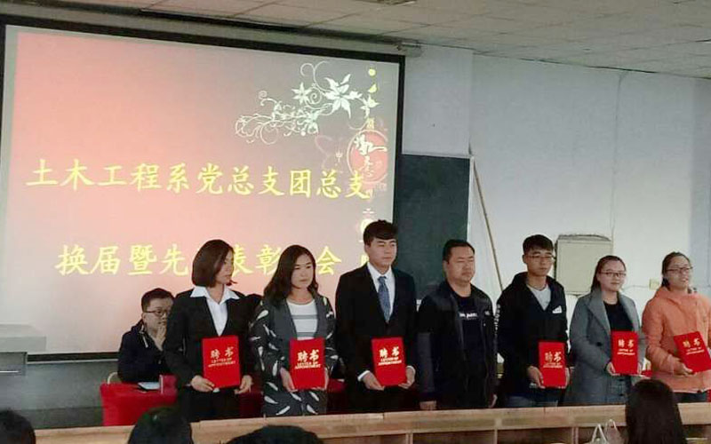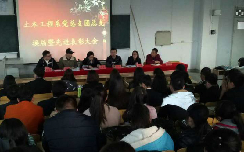 11月10日下午16:30,土木工程系党总支团总支换届暨先进表彰大会在2号教学楼315教室召开。土木工程系党总支书记尚飞,教学副主任詹春及全系教师、辅导员老师、学生代表共计200余人参加了大会。大会由土木工程系团总支书记王国玺主持。
