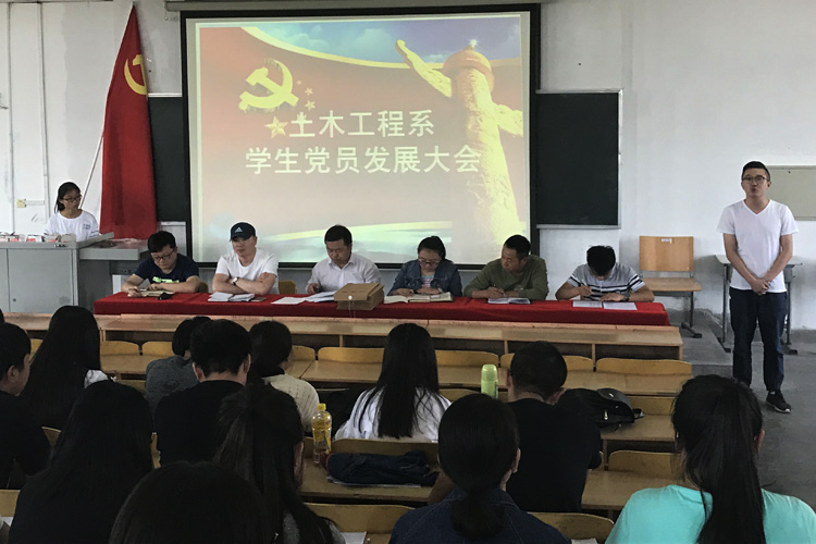 根据学院党委的安排和部署,土木工程系党总支学生党支部于6月6日下午在2号教学楼315教室召开本学期党员发展大会。土木工程系党总支书记尚飞,党政秘书祁海云,学生党支部书记成志军,团总支书记王国玺,辅导员张希伟以及全体学生党员,第54期、55期入党积极分子,共计100余人参加了大会。会议由学生党支部副书记董剑主持。