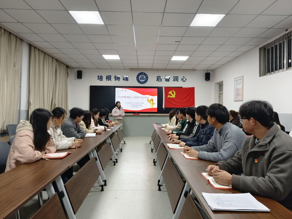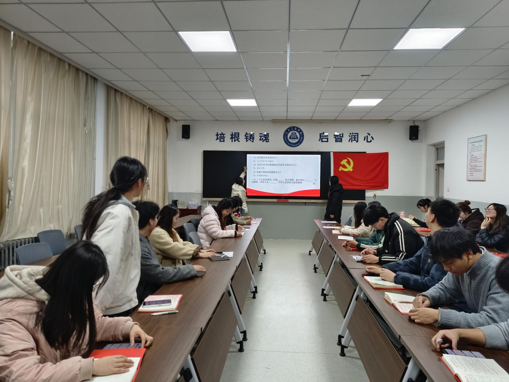 专题党课环节,文法学院学生第一党支部书记侯媛同志与土木工程学院学生第三党支部书记张国龙同志分别讲授党课并形成互补。侯媛同志围绕“学习贯彻党的二十届四中全会精神”,阐释其时代内涵与政策导向,结合高校党建实际给出实践路径,强调信息技术赋能党建的重要性,助力全会精神转化为学科实践。张国龙同志结合“以实践强本领 以志愿显担当”主题,融入工科专业特色与前沿视角,说明实践与志愿活动是锤炼本领、践行初心的重要载体,为理论与业务深度融合提供清晰思路。两堂党课立足实际、各有侧重,共同推动理论学习与实践应用深度结合。