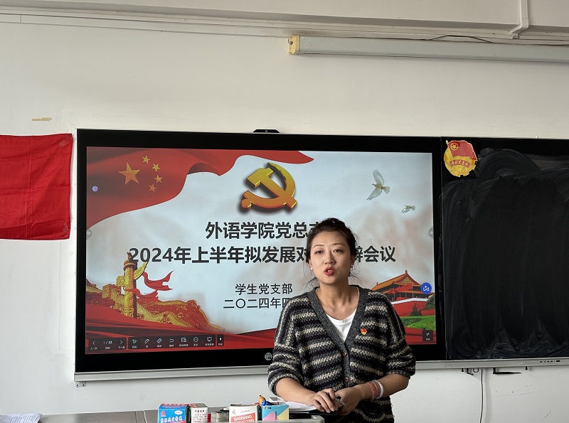 为全面深入地了解拟发展对象的思想政治觉悟及日常表现,加强对党员对象的发展与培养,教育与考察,进一步提升党员的个人品质。根据《中国共产党章程》和《中国共产党发展党员工作细则》和学校党委相关文件要求,结合我院党总支工作实际。外语学院于2024年4月16日在四号教学楼606教室召开拟发展对象公开答辩会议,出席本次会议的有外语学院党总支书记张钰同志、外语学院学生党支部书记兼党政秘书滕婧茹同志、外语学院团总支书记田煜同志。