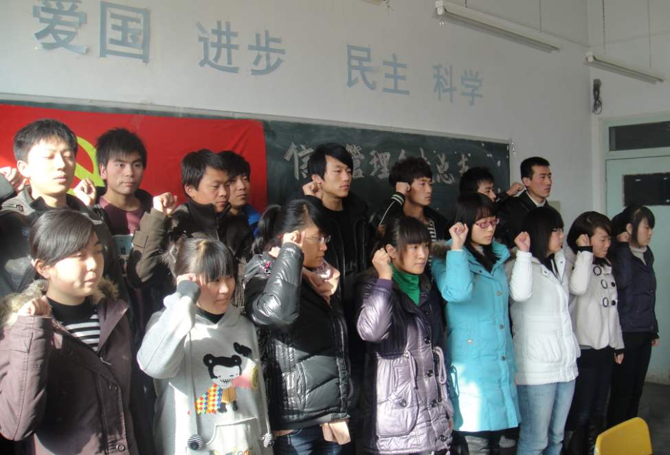 随着国际歌的奏响,大会正式开始。首先,对王琼等6名同学能否发展为中共预备党员进行了讨论,一致同意王琼等6名同学加入中国共产党。其次,对何耀宗等5名同学能否按期转正问题进行了讨论,大家各抒己见,分别对何耀宗等5名同学在一年的预备期的表现进行了评价,提出了建议,总体他们符合一名正式党员的标准,大家一致同意何耀宗等5名同学按期转正。最后,会议开始了庄严地宣誓,全体宣誓人持立正姿势,站在党旗下,在领誓人的领读下,全体党员逐句跟读誓词,郑重地向党组织许下承诺。