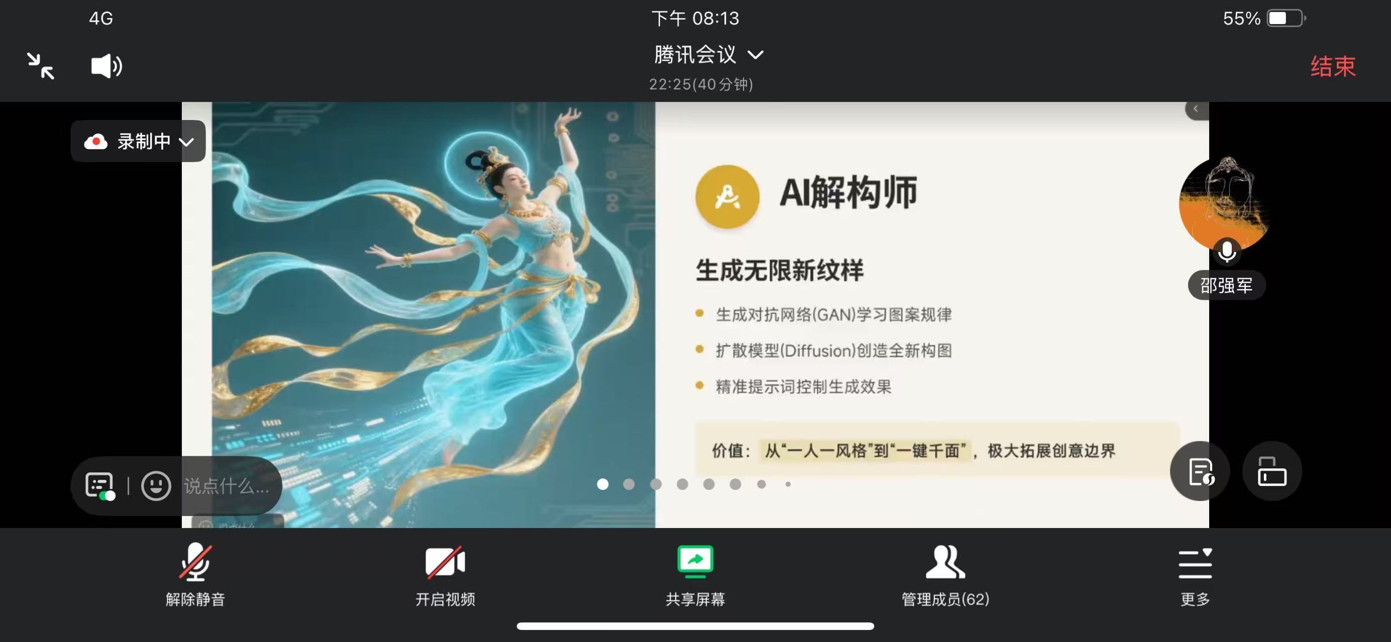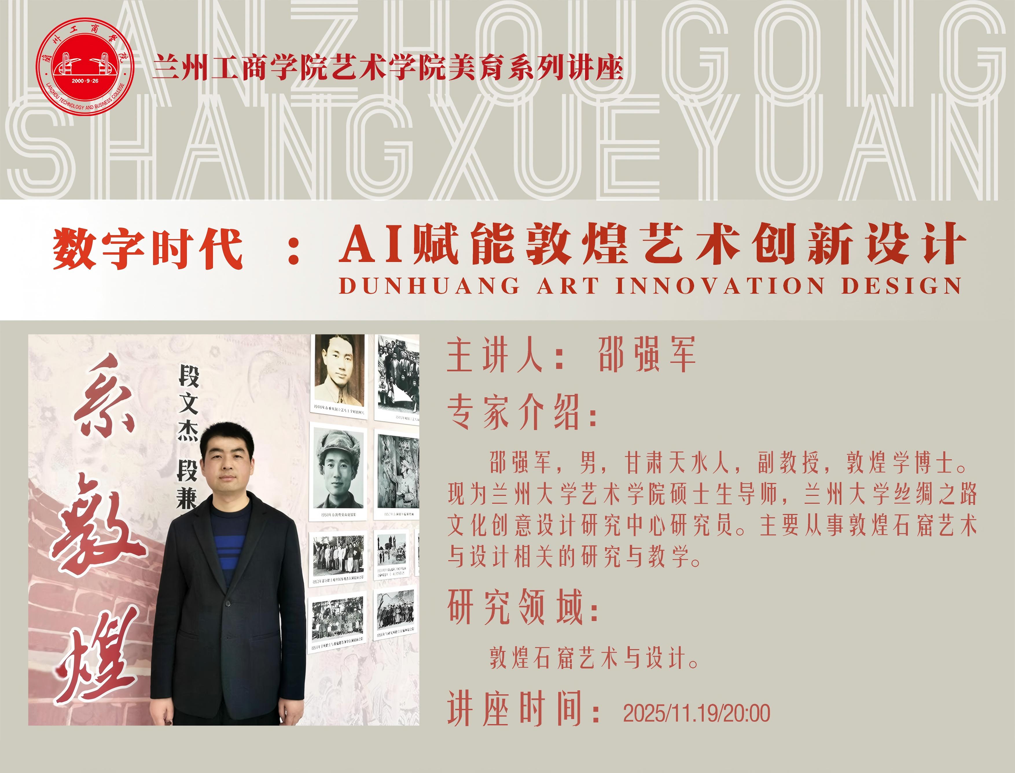 20251119日,艺术学院举办了一场主题为《AI赋能敦煌艺术创新设计》的线上美育讲座。活动通过腾讯会议平台进行,特邀兰州大学副教授邵强军担任主讲,吸引了全校公选课《Photoshop图像处理与应用》的学生及部分视觉传达设计专业学生在线参与。